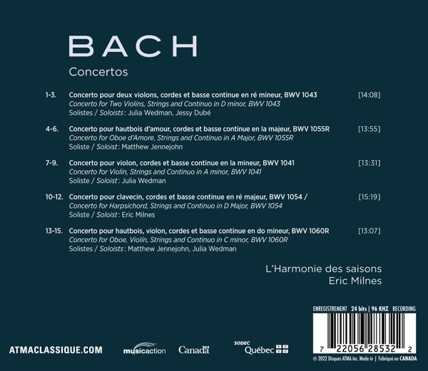 Concerto in d-Moll für 2 Violinen BWV 1043 01. Julia Wedman "I. Vivace" 02. Julia Wedman "II. Largo m non tanto" 03. Julia Wedman "III. Allegro" Concerto in A-Dur für Oboe d'amore 04. Matthew Jennejohn "I. Allegro" 05. Matthew Jennejohn "II. Larghetto" 06. Matthew Jennejohn "III. Allegro ma non tanto" Concerto in a-Moll BWV1041 07. Julia Wedman "I. Allegro" 08. Julia Wedman "II. Andante" 09. Julia Wedman "III. Allegro assai" Concerto in D-Dur für Cembalo BWV1054 10. Eric Milnes "I. Allegro" 11. Eric Milnes "II. Adagio e piano sempre" 12. Eric Milnes "III. Allegro" Concerto in c-Moll für Oboe & Violine BWV 1060R 13. Matthew Jennejohn "I. Allegro" 14. Matthew Jennejohn "II. Adagio" 15. Matthew Jennejohn "III. Allegro"