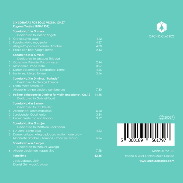 Beschreibung:Following his acclaimed release of the Brahms and Schoenberg Violin Concertos, Jack Liebeck returns to Orchid Classics with Ysaÿe's Six Sonatas for Solo Violin, as well as the lyrical Poème élégiaque for violin and piano, for which Liebeck is joined by Daniel Grimwood. Ysaÿe was hailed as the greatest violinist of his day until illness cut short his career as a soloist, prompting him to channel his energies into writing these sonatas dedicated to six of his most outstanding contemporaries, including George Enescu and Fritz Kreisler. Ysaÿe's Six Sonatas were inspired by hearing Joseph Szigeti play J.S. Bach's Sonata for solo violin in G minor, BWV 1001, and Bach's influence is palpable throughout, alongside folk idioms that reflect the nationality of each dedicatee, and more characteristic 20th-century elements such as dissonance and quarter tones. This mixture is bound together by the dazzling virtuosity one would expect from a master of the instrument. Liebeck navigates these nuances with the combination of delicacy and bravura demanded by these stunning pieces., Runningtime: 00:00:00, Composed By: Eugène Ysaÿe, Liner Notes: Joanna Wyld, Piano: Daniel Grimwood, Violin: Jack Liebeck, Labelcode ORCC100179.2 (ORC 100179), Phonographic Copyright (p) Orchid Classics Ltd, Copyright (c) Orchid Classics Ltd