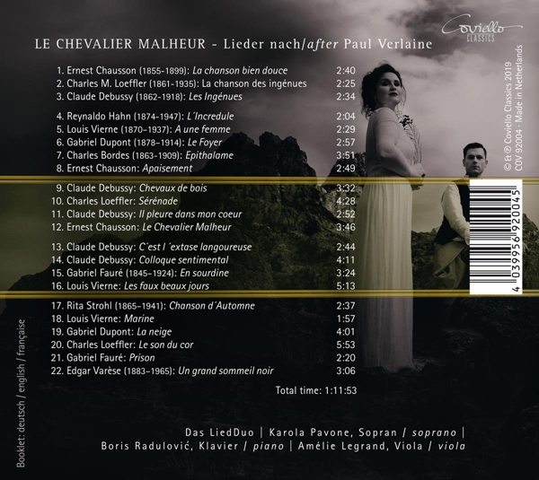 Beschreibung:Paul Verlaine (1844-1896) is considered the most widely read French poet ever. His extremely fine feeling for sensuality, melody and pictoriality, as well as for the sound of language, is omnipresent in his poems. Although this makes it very difficult to translate, he is virtually predestined for song compositions. In addition to classics of French melodies such as Gabriel Faure and Claude Debussy, soprano Karola Pavone and her accompanist Boris Radulovic dedicate their recording for COVIELLO to some otherwise underrepresented song composers such as Gabriel Dupont and Reynaldo Hahn, whose settings of the verses Verlaine, by the way, greatly appreciated., Runningtime: 00:00:00, Ensemble: Das LiedDuo, Piano: Boris Radulovi? (2), Soprano Vocals: Karola Pavone, Viola: Amélie Legrand (2), Composed By: Ernest Chausson, Composed By: Charles Martin Loeffler, Composed By: Claude Debussy, Composed By: Reynaldo Hahn, Composed By: Louis Vierne, Composed By: Gabriel Dupont, Composed By: Charles Bordes, Composed By: Ernest Chausson, Composed By: Claude Debussy, Composed By: Charles Martin Loeffler, Composed By: Claude Debussy, Composed By: Ernest Chausson, Composed By: Claude Debussy, Composed By: Claude Debussy, Composed By: Gabriel Fauré, Composed By: Louis Vierne, Composed By: Rita Strohl, Composed By: Louis Vierne, Composed By: Gabriel Dupont, Composed By: Charles Martin Loeffler, Composed By: Gabriel Fauré, Composed By: Edgard Varèse, Labelcode COVC92004.2 (COV 92004), Phonographic Copyright (p) Coviello Classics, Copyright (c) Coviello Classics
