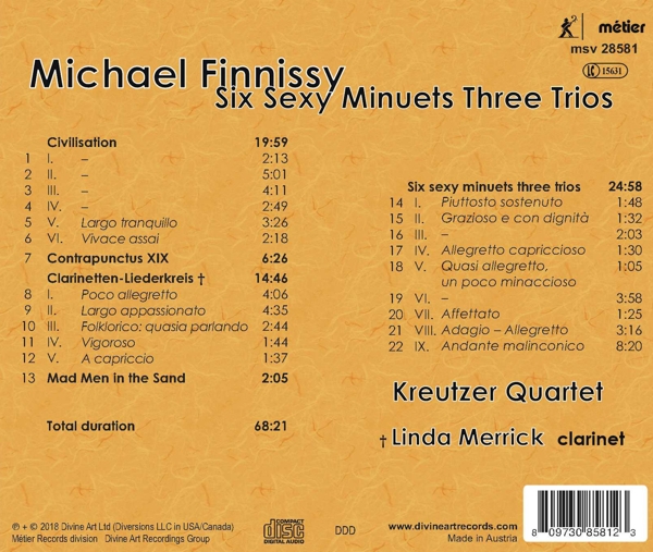 Civilisation 01. Trandafilovski, Mihailo "1. Ohne Satzbezeichnung" 02. Trandafilovski, Mihailo "2. Ohne Satzbezeichnung" 03. Trandafilovski, Mihailo "3. Ohne Satzbezeichnung" 04. Trandafilovski, Mihailo "4. Ohne Satzbezeichnung" 05. Trandafilovski, Mihailo "5. Largo tranquillo" 06. Trandafilovski, Mihailo "6. Vivace assai" 07. Trandafilovski, Mihailo "Contrapunctus Nr. 19" Clarinetten-Liederkreis 08. Merrick, Linda "1. Poco allegretto" 09. Merrick, Linda "2. Largo appassionato" 10. Merrick, Linda "3. Folklorico: Quasia parlando" 11. Merrick, Linda "4. Vigoroso" 12. Merrick, Linda "5. A capriccio" 13. Trandafilovski, Mihailo "Mad men in the sand" Six sexy minuets three trios 14. Trandafilovski, Mihailo "Nr. 1 Piuttosto sostenuto" 15. Trandafilovski, Mihailo "Nr. 2 Grazioso e con dignit?" 16. Trandafilovski, Mihailo "Nr. 3 Ohne Satzbezeichnung" 17. Trandafilovski, Mihailo "Nr. 4 Allegretto capriccioso" 18. Trandafilovski, Mihailo "Nr. 5 Quasi allegretto, un poco minaccioso" 19. Trandafilovski, Mihailo "Nr. 6 Ohne Satzbezeichnung" 20. Trandafilovski, Mihailo "Nr. 7 Affettato" 21. Trandafilovski, Mihailo "Nr. 8 Adagio - Allegretto" 22. Trandafilovski, Mihailo "Nr. 9 Andante malinconico"