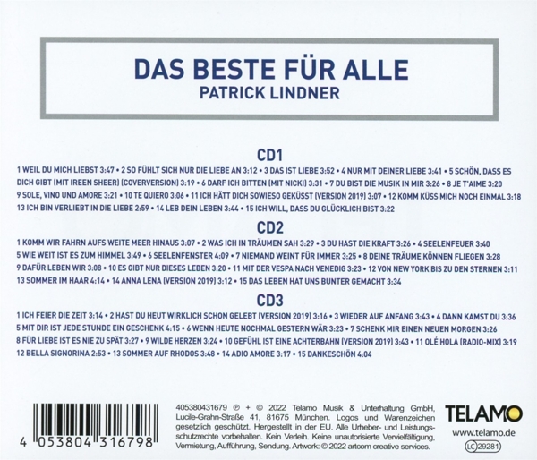 Disc 01 01. Lindner, Patrick "Weil du mich liebst" 02. Lindner, Patrick "So fühlt sich nur die Liebe an" 03. Lindner, Patrick "Das ist Liebe" 04. Lindner, Patrick "Nur mit deiner Liebe" 05. Lindner, Patrick / Sheer, Ireen "Sch?n, dass es dich gibt" 06. Lindner, Patrick / Nicki "Darf ich bitten" 07. Lindner, Patrick "Du bist die Musik in mir" 08. Lindner, Patrick "Je t'aime" 09. Lindner, Patrick "Sole, Vino und Amore" 10. Lindner, Patrick "Te quiero" 11. Lindner, Patrick "Ich h?tt dich sowieso geküsst (Version 2019)" 12. Lindner, Patrick "Komm küss mich noch einmal" 13. Lindner, Patrick "Ich bin verliebt in die Liebe" 14. Lindner, Patrick "Leb dein Leben" 15. Lindner, Patrick "Ich will, dass du glücklich bist"
