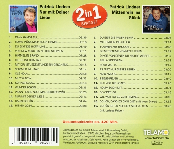 Disc 02 01. Lindner, Patrick "Du bist die Musik in mir" 02. Lindner, Patrick "Mittenrein ins Glück" 03. Lindner, Patrick "Sommer auf Rhodos" 04. Lindner, Patrick "Deine Tr?ume k?nnen fliegen" 05. Lindner, Patrick "Dinge, von denen du nichts weißt" 06. Lindner, Patrick "Bella Signorina" 07. Lindner, Patrick "1000 mal Ja" 08. Lindner, Patrick "Es gibt nur dieses Leben" 09. Lindner, Patrick "Adio Amore" 10. Lindner, Patrick "Seelenfeuer" 11. Lindner, Patrick "Du hast die Kraft" 12. Lindner, Patrick "Komm doch mit" 13. Lindner, Patrick "So oder so" 14. Lindner, Patrick "Wie weit ist es zum Himmel" 15. Lindner, Patrick / Sheer, Ireen "Sch?n, dass es dich gibt" 16. Lindner, Patrick / Felber, Larissa "Sch?n ist es auf der Welt zu sein"