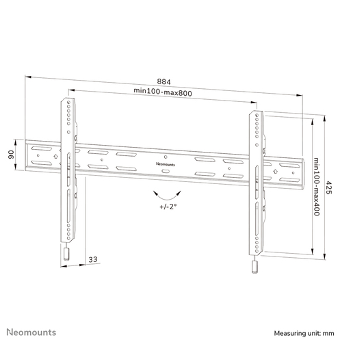 Verpackungsdaten | | Verpackungsbreite | 904 mm | | Verpackungstiefe | 158 mm | | Verpackungshöhe | 74 mm | | Paketgewicht | 4 kg | Technische Details | | Ursprungsland | China | | Nettogewicht Verpackung | 4 kg | | Abschließbar | Sicherheitsschraube enthalten | Montage | | Anzahl der Display unterstützt | 1 | | Maximale Gewichtskapazität (pro Monitor) | 60 kg | | Maximale Bildschirmgröße | 2,18 m | | Befestigungstyp | Wand | | Höchstgewichtskapazität | 60 kg | | Minimale VESA-Halterung | 100 x 100 mm | | Maximale VESA-Halterung | 800 x 400 mm | | Minimum Bildschirmgröße | 109,2 cm | | Panel-Montage-Schnittstelle | 100 x 200,100 x 100,100 x 150,120 x 120,150 x 200,200 x 100,200 x 150,200 x 200,200 x 300,200 x 400,300 x 100,300 x 200,300 x 300,350 x 350,400 x 200,400 x 300,400 x 400,440 x 400,500 x 400,600 x 300,600 x 200,600 x 400,680 x 300,800 x 200,800 x 400 mm | Logistikdaten | | Breite des Versandkartons | 924 mm | | Länge des Versandkartons | 240 mm | | Höhe des Versandkartons | 343 mm | | Gewicht Versandkarton | 24,7 kg | | Nettogewicht Hauptkarton | 18 kg | | Anzahl Produkte pro Versandkarton | 6 Stück(e) | | Warentarifnummer (HS) | 7326909890 | | Anzahl pro Europalette | 72 Stück(e) | Gewicht und Abmessungen | | Breite | 884 mm | | Tiefe | 33 mm | | Tiefe (max) | 3,3 cm | | Höhe | 425 mm | | Gewicht | 2,7 kg | Ergonomie | | Höhenverstellung | Ja | | Höhenanpassungsrate | 0 - 20 mm | | Typ(en) | Fixed | | Abstand zur Wand (max) | 3,3 cm | Design | | Produktfarbe | Schwarz | | Gehäusematerial | Stahl |