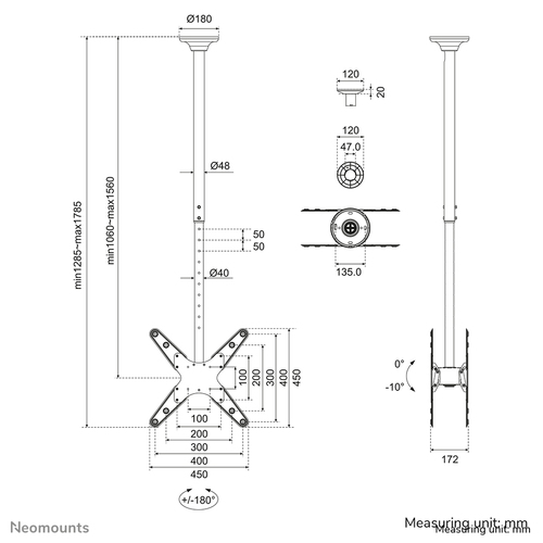 | Beschreibung: | Die Neomounts FPMA-C340DBLACK ist eine vollbewegliche Deckenhalterung für 2 Flachbildschirme bis zu 75". Die einzigartige Neigungs- (10°), Dreh- (360°) und Rotationstechnologie (6°) ermöglicht es der Halterung, den besten Winkel für die optimale Betrachtungsposition zu finden.Die Deckenhalterung kann leicht in der Höhe von 106 bis 156 cm* verstellt werden und hat eine Tragfähigkeit von 50 kg (2x). Die FPMA-C340DBLACK ist für Bildschirme geeignet, die dem VESA-Lochbild 100x100 bis 400x400mm entsprechenKurzinfo: Neomounts by Newstar - Befestigungskit (Deckenmontage) - full-motion - für 2 LCD-/Plasma-Konsolen - Schwarz - Bildschirmgröße: 81.28-190.5 cm (32"-75") Gruppe AV-Möbel Hersteller Neomounts by Newstar Hersteller Art. Nr. FPMA-C340DBLACK Modell by Newstar EAN/UPC 8717371449445 Produktbeschreibung: Neomounts by Newstar - Befestigungskit - full-motion - für 2 LCD-/Plasma-Konsolen - Schwarz Produkttyp Befestigungskit (full-motion) Montagekomponenten Deckenmontage Abmessungen (Breite x Tiefe x Höhe) 45 cm x 18 cm Einstellbare Höhe 128.5-178.5 cm Neigung 10° Rotation 6° Drehen 360° Anpassungen Höhe, Neigung, schwenken, Drehung Empfohlene Verwendung 2 LCD-/Plasma-Konsolen Empfohlene Display-Größe 81.28-190.5 cm (32"-75") VESA-Halterung 100 x 100 mm, 200 x 200 mm, 400 x 300 mm, 400 x 200 mm, 400 x 400 mm, 200 x 100 mm, 300 x 300 mm Max. Ladegewicht 100 kg Farbe Schwarz Packungsinhalt 2 dekorative Abdeckungen Ausführliche Details Allgemein Breite 45 cm Tiefe 18 cm Einstellbare Höhe 128.5-178.5 |  | | Herstellernummer: |