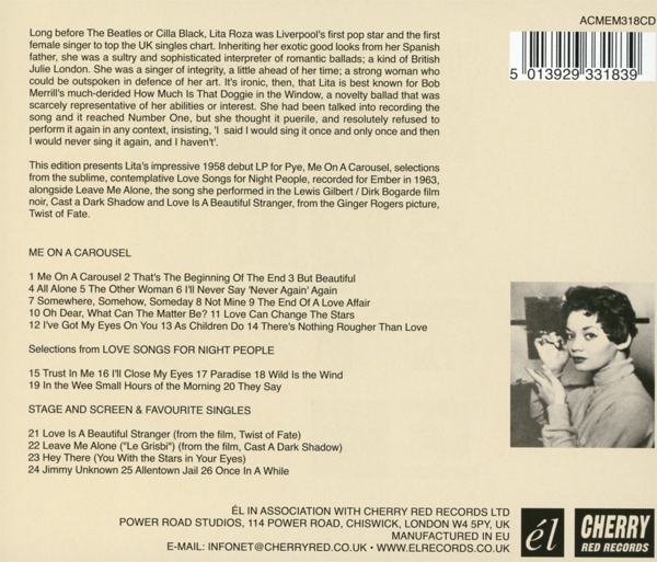 01. Roza, Lita / Shepherd, Bill Orchestra "Me on a carousel" 02. Roza, Lita / Shepherd, Bill Orchestra "That's the beginning of the end" 03. Roza, Lita / Shepherd, Bill Orchestra "But beautiful" 04. Roza, Lita / Shepherd, Bill Orchestra "All alone" 05. Roza, Lita / Shepherd, Bill Orchestra "The other woman" 06. Roza, Lita / Shepherd, Bill Orchestra "I'll never say "Never again" again" 07. Roza, Lita / Shepherd, Bill Orchestra "Somewhere, somehow, someday" 08. Roza, Lita / Shepherd, Bill Orchestra "Not mine" 09. Roza, Lita / Shepherd, Bill Orchestra "The end of a love affair" 10. Roza, Lita / Shepherd, Bill Orchestra "Oh dear, what can the matter be?" 11. Roza, Lita / Shepherd, Bill Orchestra "Love can change the stars" 12. Roza, Lita / Shepherd, Bill Orchestra "I've got my eyes on you" 13. Roza, Lita / Shepherd, Bill Orchestra "As children do" 14. Roza, Lita / Shepherd, Bill Orchestra "There's nothing rougher than love" 15. Roza, Lita "Trust in me" 16. Roza, Lita "I'll close my eyes" 17. Roza, Lita "Paradise" 18. Roza, Lita "Wild is the wind" 19. Roza, Lita "In the wee small hours of the morning" 20. Roza, Lita "They say" 21. Roza, Lita "Love is a beautiful stranger ("Twist of fate")" 22. Roza, Lita "Leave me alone (Le Grisbi) ("Cast a dark shadow")" 23. Roza, Lita "Hey there (You with the stars in your eyes)" 24. Roza, Lita "Jimmy Unknown" 25. Roza, Lita "Allentown Jail" 26. Roza, Lita "Once in a while"
