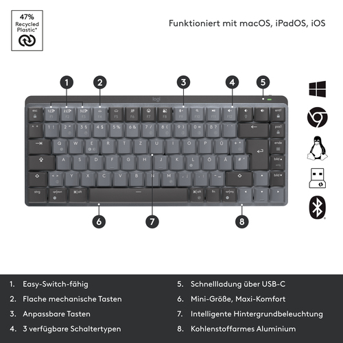 Master Series MX Mechanical Mini - Tastatur - hinterleuchtet - kabellos - Bluetooth LE - QWERTZ - Deutsch - Tastenschalter: Tact [DE-Version, German Keyboard]