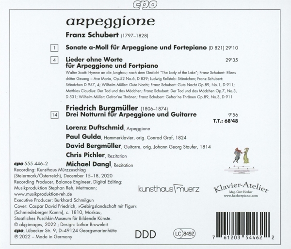 | | Beschreibung: | The Guitare d'amour in Romanticism. Franz Schubert's so-called "Arpeggione Sonata" owes it's peculiar name to a long-forgotten string instrument that was usually referred to in Vienna in the 1820s as the "bowed guitar" or "guitar-violoncello". It was an invention of the Viennese instrument maker Georg Stauffer and was quite popular for about a decade. After that, it disappeared into the annals of history. If Schubert had not dedicated his famous sonata to the instrument, the arpeggione would have been long forgotten. But this way, the memory of the instrument was kept alive. To complement the great "Arpeggione Sonata", soloist Lorenz Duftschmid has recorded five Schubert songs in instrumental versions (the poems in question are recited before the instrumental version in each case) as well as three nocturnes by an almost forgotten Romantic from the Rhineland: Friedrich Burgmüller. His "Trois Nocturnes", available in various versions, sound most beautiful and full of emotion on arpeggione and guitar, the two instruments so closely related., Runningtime: 00:00:00, Classical Guitar [Guitarre]: David Bergmüller, Cover: Caspar David Friedrich, Design: Lothar Bruweleit, Executive-Producer: Burkhard Schmilgun, Fortepiano [Hammerklavier]: Paul Gulda, Liner Notes: Karl Böhmer, Liner Notes: Lorenz Duftschmid, Liner Notes [Translated By]: Daniel Costello (3), Producer [Recording Producer], Engineer [Balance Engineer], Edited By [Digital Editing]: Musikproduktion Stephan Reh, Strings [Arpeggione]: Lorenz Duftschmid, Composed By: Franz Schubert, Lyrics By: Sir Walter Scott, Speech [Rezitation]: Chris Pichler, Composed By: Franz Schubert, Lyrics By: Ludwig Rellstab, Speech [Rezitation]: Michael Dangl, Composed By: Franz Schubert, Lyrics By: Wilhelm Müller, Speech [Rezitation]: Michael Dangl, Composed By: Franz Schubert, Lyrics By: Matthias Claudius, Speech [Rezitation]: Chris Pichler, Speech [Rezitation]: Michael Dangl, Composed By: Franz Schubert, Lyrics By: Wilhelm Müller, Speech [Rezitation]: Michael Dangl, Composed By: Franz Schubert, Composed By: Johann Friedrich Franz Burgmüller, Labelcode CPO555446.2 (555 446-2), Record Company Classic Produktion Osnabrück, Copyright (c) cpo, Copyright (c) Brigitte Täubl, Copyright (c) akg-images, Recorded At Kunsthaus Mürzzuschlag, Glass Mastered At Sonopress |  | | Anzahl der Titel: |
