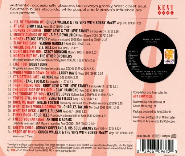 01. Walker, Chuck / Vips, The / McVay, Bobby "I'll be standing by" 02. Bee, Jimmy "At last" 03. Love, Rudy / Love Family, The "Hungry children" 04. B P S Revolution "Mighty clouds of joy" 05. Taylor, Felice "Honey" 06. Garrett, Vernon "Slow and easy" 07. Hill, Z.Z. "Where she att" 08. Johnson, Stacy "Don't believe him" 09. Other Brothers, The "Nobody but me" 10. John, Bobby "Like I do" 11. Davis, Larry "Whole world down on you" 12. King, Al "It's getting late" 13. Foster, Earl "Jodine" 14. Love, Rudy / Love Family, The "Then I found you" 15. Hammond, Clay "The good side of my girl" 16. Jones, Jeanette "The thought of you" 17. Fields, Venetta "You're still my baby" 18. Foster, Millie "Rock me baby" 19. Taylor, Charles "What is this world coming to" 20. Fulson, Lowell "What the heck" 21. Four Tees "Funky duck" 22. Adams, Arthur K "I need you (Alt Take)" 23. Copeland, Johnny & His Soul Agents "Ghetto child" 24. Walker, Chuck / Vips, The / McVay, Bobby "Peace of mind"