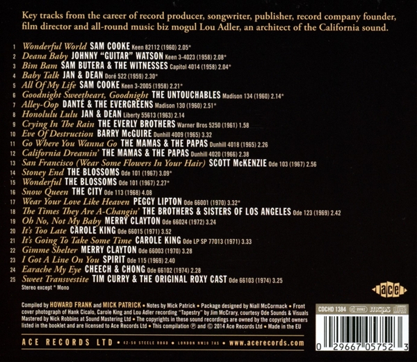 | | Beschreibung: | Compiled By: Howard Frank, Compiled By, Liner Notes: Mick Patrick, Design [Package]: Niall Mccormack, Mastered By: Nick Robbins, Written-By: Herb Alpert, Written-By: Lou Adler, Written-By: Sam Cooke, Written-By: Herb Alpert, Written-By: Lou Adler, Written-By: Herb Alpert, Written-By: Lou Adler, Producer: Herb Alpert, Producer: Lou Adler, Written-By: Melvin Schwartz, Written-By: Herb Alpert, Written-By: Lou Adler, Producer: Herb Alpert, Producer: Lou Adler, Written-By: James Bracken, Written-By: James Hudson, Producer: Herb Alpert, Producer: Lou Adler, Written-By: Dallas Frazier, Written-By: Roger Christian, Written-By, Producer, Arranged By: Jan Berry, Written-By, Supervised By [Musical]: Lou Adler, Producer: Lou Adler, Written-By: Carole King, Written-By: Howard Greenfield, Producer: Lou Adler, Producer: P.F. Sloan, Producer: Steve Barri, Written-By: P.F. Sloan, Producer: Lou Adler, Written-By: John Phillips, Written-By: John Phillips, Written-By: Michelle Phillips, Producer: Lou Adler, Written-By, Producer: John Phillips, Producer: Lou Adler, Written-By: Laura Nyro, Producer: Lou Adler, Written-By: Don Altfeld, Written-By: Fred Weider, Written-By: Jill Gibson, Producer: Lou Adler, Written-By: Goffin And King, Producer: Lou Adler, Written-By: Donovan Phillips Leitch, Producer, Directed By: Lou Adler, Written-By: Bob Dylan, Producer: Lou Adler, Written-By: Goffin And King, Producer: Lou Adler, Written-By: Carole King, Written-By: Toni Stern, Producer: Lou Adler, Written-By: Carole King, Written-By: Toni Stern, Producer: Lou Adler, Written-By: Jagger-Richards, Producer: Lou Adler, Written-By: Randy California, Producer: Lou Adler, Written-By: Gaye Delorme, Written-By: Richard Marin (2), Written-By: Thomas Chong, Producer: Lou Adler, Written-By: Richard O'Brien, Labelcode IMT1124116.2 (CDCHD 1384), Phonographic Copyright (p) Ace Records Ltd., Copyright (c) Ace Records Ltd., Manufactured By Sound Performance |  | | Produzent: |