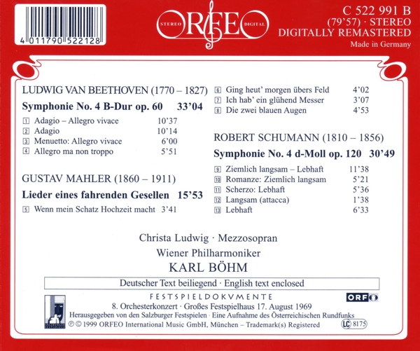| Beschreibung: | Runningtime: 00:00:00, Booklet Editor: Christiane Delank, Booklet Editor: Dr. Axel Schröter, Design [Cover]: Atelier Langenfass, Engineer: Meinhard Leitich, Orchestra: Wiener Philharmoniker, Photography By: Archiv Der Salzburger Festspiele, Recording Supervisor: Friedrich Szvjatko, Remastered By: Othmar Eichinger, Remastered By, Supervised By [Artistic]: Gottfried Kraus, Composed By: Ludwig van Beethoven, Composed By: Gustav Mahler, Composed By: Robert Schumann, Labelcode OEO522991.2 (C 522 991 B), Phonographic Copyright (p) ORFEO International Music GmbH, Copyright (c) ORFEO International Music GmbH, Recorded At Großes Festspielhaus, Salzburg, Glass Mastered At P+O Pallas |