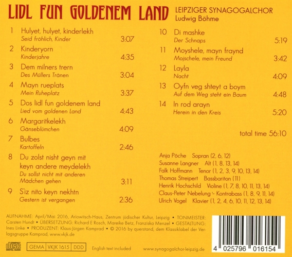 01. Langner, Susanne "Seid fr?hlich, Kinder (arr. von Fredo Jung)" 02. P?che, Anja "Kinderjahre (arr. von Juan Garcia)" 03. Hoffmann, Falk "Des Müllers Tr?nen (arr. von Walter Thomas Heyn)" 04. Leipziger Synagogalchor "Mein Ruheplatz (arr. von Ludwig B?hme)" 05. Leipziger Synagogalchor "Lied vom goldenen Land (arr. von Philip Lawson)" 06. P?che, Anja "G?nseblümchen (arr. von Friedbert Groß)" 07. Leipziger Synagogalchor "Kartoffeln (arr. von Walter Thomas Heyn)" 08. Langner, Susanne "Du sollst nicht mit anderen M?dchen gehen (arr. von Walter Thomas Heyn)" 09. Hoffmann, Falk "Gestern ist vergangen (arr. von Ludwig B?hme)" 10. Hoffmann, Falk "Der Schnaps (arr. von Reiko Füting)" 11. Streipert, Thomas "Mojschele, mein Freund (arr. von Juan Garcia)" 12. P?che, Anja "Nacht (arr. von Werner Sander)" 13. Langner, Susanne "Auf dem Weg steht ein Baum (arr. von Fredo Jung)" 14. Langner, Susanne "Herein in den Kreis (arr. von Matthias Becker)"