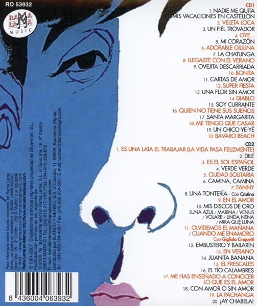 Disc 02 01. Aguil?, Luis "Es una lata el trabajar (La vida pasa felizmente)" 02. Aguil?, Luis "Dile" 03. Aguil?, Luis "Es el sol espa¤ol" 04. Aguil?, Luis "Verde verde" 05. Aguil?, Luis "Ciudad solitaria" 06. Aguil?, Luis "Camina, camina" 07. Aguil?, Luis "Fanny" 08. Aguile, Luis / Cristina "Una tonter¡a" 09. Aguil?, Luis "En el amor" 10. Aguil?, Luis "Mis discos de oro" 11. Aguile, Luis / Cinquetti, Gigliola "Olvidemos el ma¤ana / Cuando me enamoro" 12. Aguil?, Luis "Embustero y bailar¡n" 13. Aguil?, Luis "En verano" 14. Aguil?, Luis "Juanita banana" 15. Aguil?, Luis "El frescales" 16. Aguil?, Luis "El t¡o calambres" 17. Aguil?, Luis "Me has ense¤ado a conocer lo que es el amor" 18. Aguil?, Luis "Con amor o sin amor" 19. Aguil?, Luis "La pachanga" 20. Aguil?, Luis "Ay chabela!"