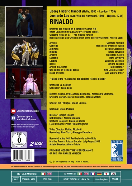 | Beschreibung: | For the first time in modern times, Festival della Valle d'Itria stages the Neapolitan version of Handel's Rinaldo, a pastiche with a Mediterranean allure which Leonardo Leo assembled in 1718 and which was considered lost until a few years ago. The story behind this most rare opera is captivating: the score of Handel's masterpiece was illegally brought to Naples by the castrato singer Nicolò Grimaldi, who first interpreted Rinaldo in London. Once in Italy, the work was rehashed by Leo as well as other local composers, who adapted it to the taste of the local Neapolitan public, adding some intermezzos and amusing characters. Director Giorgio Sangati turns this work into a "ba-rock" opera set in the 1980's, where the struggle between Christians and Turks becomes a battle between pop-rock singers (the Christians) and dark-metal ones (the Turks). These two factions represent two opposite perspectives on love and life. Conductor Fabio Luisi is at the head of the baroque Ensemble La Scintilla, a group of specialists in the baroque repertoire. Excellent reviews for the vocal cast who endured an almost 4 hour performance, special mentions to Carmela Remigio (Armida) who was defined "vocally majestic and most convincing in her acting skills", whereas Teresa Iervolino (Rinaldo) impressed the critics for her vocal and acting skills en travesti and her ability "to convey all the melancholic shades of Handel's music" (Luca Ciammarughi, classicaviva. Com)., Runningtime: 00:00:00, Labelcode DNMC37831DVD |  | Darsteller: |