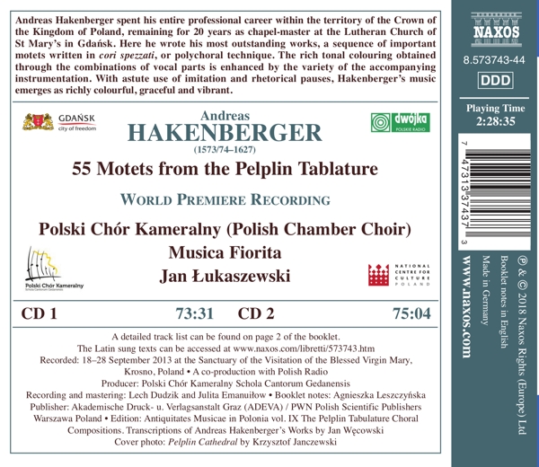 Beschreibung:Andreas Hakenberger spent his entire professional career within the territory of the Crown of the Kingdom of Poland, remaining for 20 years as chapel-master at the Lutheran Church of St. Mary's in Gdansk. Here he wrote his most outstanding works, a sequence of important motets written in cori spezzati, or polychoral technique. The rich tonal coloring obtained through the combinations of vocal parts is enhanced by the variety of the accompanying instrumentation. With astute use of imitation and rhetorical pauses, Hakenberger's music emerges as richly colorful, graceful and vibrant. There have been very few recordings of the music of Andreas Hakenberger. This release offers by far the most of his music yet to be issued, and contains all of the 55 motets preserved in the Pelplin Tablature., Runningtime: 00:00:00, Labelcode NXS8573743.2