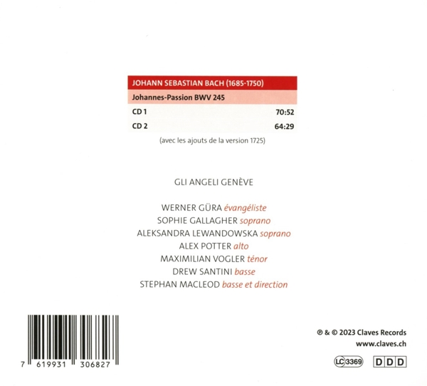 Disc 01 Johannes-Passion BWV 245 (Gesamtaufnahme) 01. "Chor: Herr, unser Herscher" 02. "Rezitativ: Jesus ging mit seinen Jüngern" 03. "Chor: Jesum von Nazareth" 04. "Rezitativ: Jesus spricht zu ihnen" 05. "Chor: Jesum von Nazareth" 06. "Rezitativ: Jesus antwortete" 07. "Choral: O große Lieb'" 08. "Rezitativ: Auf dass das Wort erfüllet würde" 09. "Choral: Dein Will gescheh" 10. "Rezitativ: Die Schar aber" 11. "Arie: Von den Stricken" 12. "Rezitativ: Simon Petrus aber" 13. "Arie: Ich folge dir gleichfalls" 14. "Rezitativ: Derselbige Jünger" 15. "Choral: Wer hat dich so geschlagen?" 16. "Rezitativ: Und Hannas" 17. "Chor: Bist du nicht" 18. "Rezitativ: Er leugnete aber" 19. "Arie: Ach, mein Sinn" 20. "Choral: Petrus, der nicht denkt zurück" 21. "Choral: Christus, der uns selig macht" 22. "Rezitativ: Da führeten sie Jesum" 23. "Chor: W?re dieser nicht ein ?belt?ter" 24. "Rezitativ: Da sprach Pilatus zu ihnen" 25. "Chor: Wir dürfen niemand t?ten" 26. "Rezitativ: Auf dass erfüllet würde" 27. "Choral: Ach großer K?nig" 28. "Rezitativ: Da sprach Pilatus zu ihm" 29. "Chor: Nicht diesen, diesen nicht" 30. "Rezitativ: Barrabas aber war ein M?rder" 31. "Arioso: Betrachte, meine Seel" 32. "Arie: Erw?ge" 33. "Rezitativ: Und die Kriegsknechte" 34. "Chor: Sei gegrüßet" 35. "Rezitativ: Und gaben ihm Backenstreiche" 36. "Choral: Kreuzige" 37. "Rezitativ: Pilatus sprach zu ihnen" 38. "Chor: Wir haben ein Gesetz" 39. "Rezitativ: Da Pilatus das Wort h?rete" 40. "Choral: Durch dein Gef?ngnis" 41. "Rezitativ und Chor: L?ssest du diesen los" 42. "Rezitativ: Da Pilatus das Wort h?rete" 43. "Chor: Weg, weg mit dem" 44. "Rezitativ: Spricht Pilatus zu ihnen" 45. "Chor: Wir haben keinen K?nig" 46. "Rezitativ: Da überantwortete er ihn" 47. "Arie: Eilt, ihr angefochtnen Seelen" 48. "Rezitativ: Allda kreuzigten sie ihn" 49. "Chor: Schreibe nicht" 50. "Rezitativ: Pilatus antwortet" 51. "Choral: In meines Herzens Grunde"