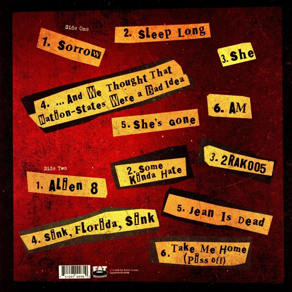 1. SORROW 2. SLEEP LONG 3. SHE 4. ...AND WE THOUGHT THAT NATION-STATES WERE A BAD IDEA 5. SHE'S GONE 6. AM 7. ALIEN 8 8. SOME KINDA HATE 9. 2RAK005 10. SINK, FLORIDA, SINK 11. JEAN IS DEAD 12. TAKE ME HOME (PISS OFF) |