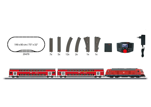Beschreibung H0 Digital-Start-Set ""Regional-Express"" Dieselelektrische Lokomotive Baureihe 245 und 2 Doppelstock-Nahverkehrswagen der Deutschen Bahn AG (DB AG). 1 Doppelstockwagen 1./2. Klasse DABza 756 und 1 Doppelstockwagen 2. Klasse DBza 751. Technische Daten: Altersklasse: ab 15 Jahre Antrieb: Auf 4 Achsen,Über Kardanwelle Bauart (Modellbahn): Personenzug Baugröße: H0 Beleuchtung: Lichtwechsel mit LEDs Gleis-System: H0 Märklin C-Gleis (mit Bettung) Haftreifen: Ja Herst.-Teilenr.: 29479 Kupplung: NEM-Schacht,Kurzkupplungs-Kinematik LüP / LüK: 753 mm Strom-System: Digital AC Sound Lieferumfang: 1 Diesellok 1 Doppelstockwagen 1./2. Klasse 1 Doppelstockwagen 2. Klasse 14 Gebogene Gleise 12 Gerade Gleise 1 Weiche links 1 Weiche rechts 1 Gleisanschlussbox 1 Schaltnetzteil 1 Mobile Station