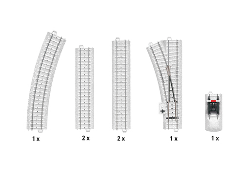 Beschreibung: Inhalt: 2 gerade Gleise 171,7 mm, 2 gerade Gleise 188,3 mm, 1 gebogenes Gleis (Weichenbogen), 1 Weiche links und 1 Prellbock in weiß mit Glitzereffekt. Aufbauanleitung.