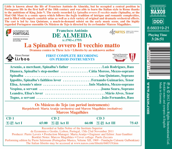 Disc 01 La Spinalba (ovvero Il vecchio matto) (Oper in 3 Akten) (Gesamtaufnahme) 01. "Ouvertüre: 1. Presto" 02. "Ouvertüre: 2. Andantino a mezza voce" 03. "Ouvertüre: 3. Minuet" 04. "Ferma Spinalba (1. Akt)" 05. "Con quante lusinghe l'infido incostante" 06. "Lode al ciel che pur giunsi" 07. "Quando m'avrai perduta" 08. "Veramente m'avvedo" 09. "Eh, t'accheta, t'accheta" 10. "Vespina, che ti par?" 11. "Fermati Elisa" 12. "Degn'? d'affetto la tua costanza" 13. "Che barbaro rigor!" 14. "Siete voi della signora" 15. "Non lo diss'io?" 16. "Lieve fiamma, che semplice e cheta" 17. "Dicea la madre di me zelosa" 18. "Poi tutti uniti..." 19. "Dille che'l primo oggetto" 20. "Prima d'andar, vediam se mi sovviene" 21. "Buon'uomo t'aiuti il Cielo" 22. "Di grazia galantuomo" 23. "Chi sta l? nel giardin?" 24. "Altol? traditor" 25. "E vuoi ammazzarmi signor" 26. "Ma, mi scusa signor, donde tant'ira?" 27. "Son questi i giuramenti?"