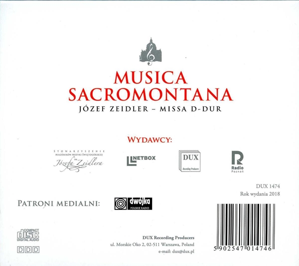 Beschreibung:The 12th Musica Sacromontana Festival (2017) saw the contemporary premiere of another work by Józef Zeidler, the spiritual patron of this event. The Mass in D major (just like the monumental Mass ex D) has been preserved in the collections of Die Bayerische Staatsbibliothek in Munich. The Mass in D major seems to be a more personal and natural work, where simplicity gains the features of conscious artistry. The music is maximally organized, both in the construction of individual phrases and larger formal entities. The MUSICA SACROMONTANA Festival is meant to continue the intentions of the Oratory of Saint Philip Neri, who wanted to evangelize through the broadly understood propagation of culture. It is thanks to their efforts that in the 17th century a great ensemble was created there, and the greatest composers, including Palestrina, came to Gostyn. Many of them wrote pieces on commission of the Congregation; fathers also filled the library with copies of works of the greatest masters., Labelcode DUX1474.2