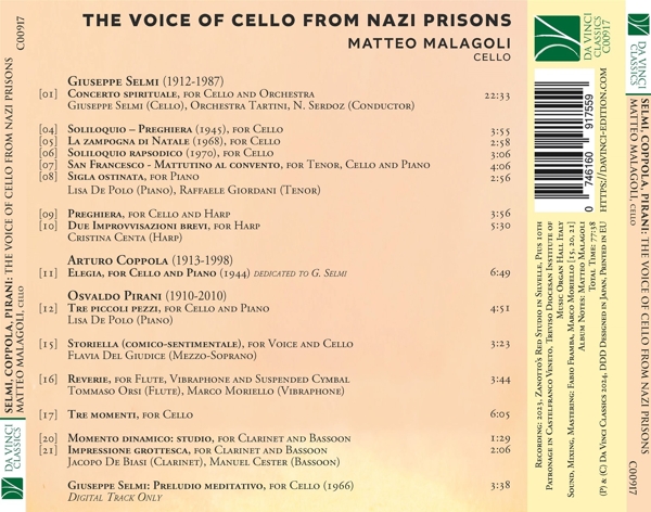 Concerto spirituale für Violoncello und Orchester 01. Malagoli, Matteo "1. Moderato - Kadenz" 02. Malagoli, Matteo "2. Adagio" 03. Malagoli, Matteo "3. Finale (Rondo)" 04. Malagoli, Matteo "Soliloquio und Preghiera für Violoncello solo (1945)" 05. Malagoli, Matteo "La Zampogna di Natale (für Violoncello solo) (1968)" 06. Malagoli, Matteo "Soliloquio rapsodico für Violoncello solo (1970)" 07. Giordani, Raffaele "San Francesco - Mattutino al convento (für Tenor, Violoncello und Klavier)" 08. De Polo, Lisa "Siglia ostinata (für Klavier)" 09. Malagoli, Matteo "Preghiera für Violoncello und Harfe" 10. Centa, Cristina "2 kurze Improvisationen für Harfe" 11. Malagoli, Matteo "Elegie für Violoncello und Klavier (1944)" 3 kleine Stücke für Violoncello und Klavier 12. Malagoli, Matteo "Nr. 1 Tarantella" 13. Malagoli, Matteo "Nr. 2 Scherzo" 14. Malagoli, Matteo "Nr. 3 Danza rituale" 15. Del Giudice, Flavia "Storiella (comico-sentimentale) (für Gesang und Violoncello)" 16. Orsi, Tommaso "Reverie für Fl?te, Vibraphon und Violoncello" Tre Momenti (für Violoncello) 17. Malagoli, Matteo "Nr. 1 Caricaturale" 18. Malagoli, Matteo "Nr. 2 Spirituale" 19. Malagoli, Matteo "Nr. 3 Frenetico" 20. De Biasi, Jacopo "Momento dinamico (Etüde für Klarinette und Fagott)" 21. De Biasi, Jacopo "Impressione grottestca (für Klarinette und Fagott)"
