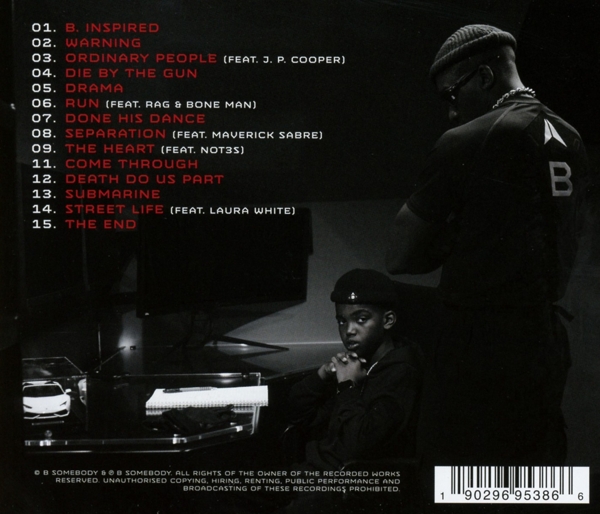 01. Malone, Bugzy "B. inspired" 02. Malone, Bugzy "Warning" 03. Malone, Bugzy / Cooper, J. P. "Ordinary people" 04. Malone, Bugzy "Die by the gun" 05. Malone, Bugzy "Drama" 06. Malone, Bugzy / Rag & Bone Man "Run" 07. Malone, Bugzy "Done his dance" 08. Malone, Bugzy / Sabre, Maverick "Separation" 09. Malone, Bugzy / Not3s "The heart" 10. Malone, Bugzy "Come through" 11. Malone, Bugzy "Death do us part" 12. Malone, Bugzy "Submarine" 13. Malone, Bugzy / White, Laura "Street life" 14. Malone, Bugzy "The end"