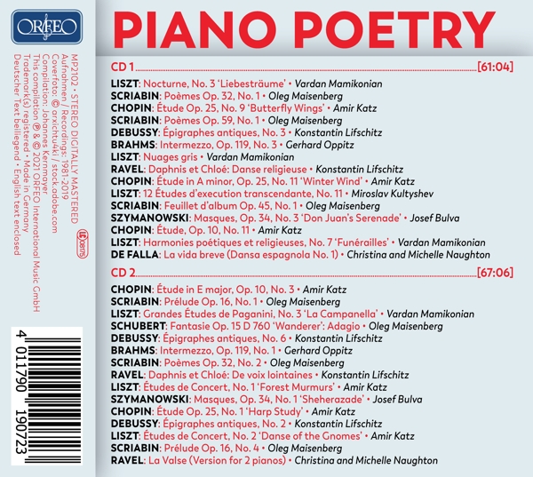Disc 02 Etüden op. 10 Nr. 1-12 (Auszug) 01. Katz, Amir "Nr. 3 Etüde E-Dur" Pr?ludes op. 16 Nr. 1-5 (Auszug) 02. Maisenberg, Oleg "Nr. 1 Pr?lude Nr. 1" Grandes ?tudes de Paganini S 141 Nr. 1-6 (Auszug) 03. Mamikonian, Vardan "Nr. 3 La Campanella" Fantasie C-Dur op. 15 D 760 "Wanderer-Fantasie" (Auszug) 04. Maisenberg, Oleg "2. Adagio" Six ?pigraphes antiques (Auszug) 05. Lifschitz, Konstantin "Nr. 6 Pour remercier la pluie au matin" Stücke für Klavier op. 119 Nr. 1-4 (Auszug) 06. Oppitz, Gerhard "Nr. 1 Intermezzo h-moll" Po?mes op. 32 Nr. 1-2 (Auszug) 07. Maisenberg, Oleg "Nr. 2 Po?me Nr. 2" Daphnis et Chlo? (Ballett) (Auszug) 08. Lifschitz, Konstantin "De voix lointaines (bearb. von Konstantin Lifschitz)" 09. Katz, Amir "Waldesrauschen (Dans le bois) S 145,1" Masken op. 34 (3 Stücke für Klavier) (Auszug) 10. Bulva, Josef "Nr. 1 Sh?h?razade" Etüden op. 25 Nr. 1-12 (Auszug) 11. Katz, Amir "Nr. 1 Harfenstudie" Six ?pigraphes antiques (Auszug) 12. Lifschitz, Konstantin "Nr. 2 Pour un tombeau sans nom" 13. Katz, Amir "Gnomenreigen (Ronde des lutins) S 145" Pr?ludes op. 16 Nr. 1-5 (Auszug) 14. Maisenberg, Oleg "Nr. 4 Pr?lude Nr. 4" 15. Naughton, Michelle "La Valse (Tanzdichtung) (Fassung für 2 Klaviere)"