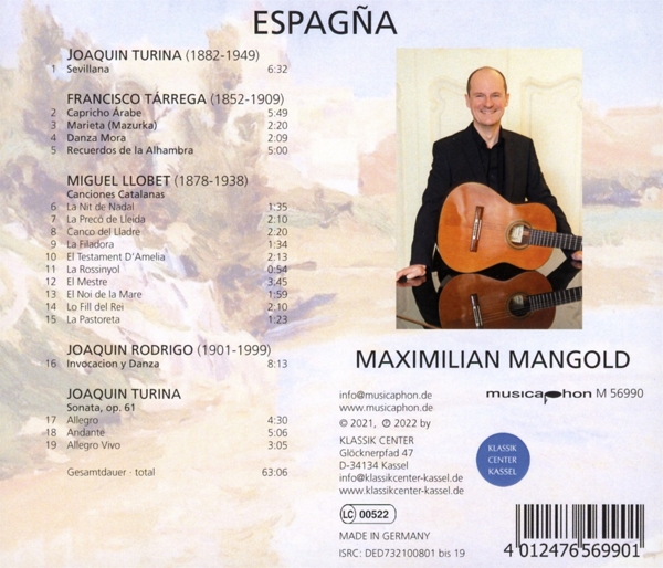 01. "Sevillana op. 29 (Fantasie)" 02. "Capricho árabe" 03. "Mazurka Nr. 3 (Marieta)" 04. "Danza mora" 05. "Recuerdos de la Alhambra" Canci¢nes populares Catalanas (13 katalanische Volkslieder) (Querschnitt) 06. "La Nit de Nadal" 07. "La Prec¢ de Lleida" 08. "Canco del Lladre" 09. "La Filadora" 10. "El Testament D'Amelia" 11. "La Rossinyol" 12. "El Mestre" 13. "El Noi de la Mare" 14. "Lo Fill del Rei" 15. "La Pastoreta" 16. "Invocaci¢n y Danza (Einleitung und Tanz) (Hommage ? Manuel de Falla)" Sonate op. 61 17. "1. Allegro" 18. "2. Andante" 19. "3. Allegro vivo"