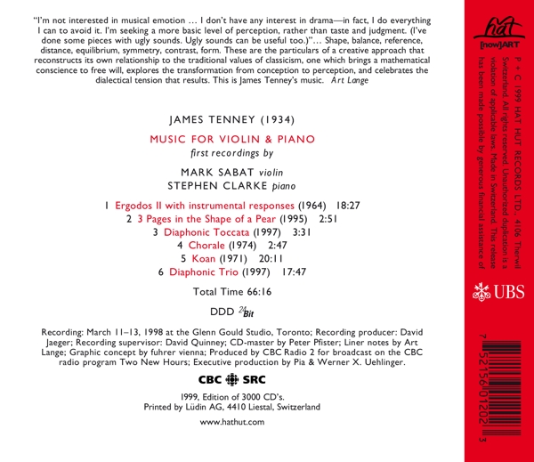 | Beschreibung: | Composed By: James Tenney, Design [Graphic Concept]: fuhrer vienna, Executive-Producer: Pia & Werner X. Uehlinger, Liner Notes: Art Lange, Mastered By [CD-master]: Peter Pfister, Piano: Stephen Clarke (2), Producer [Recording]: David Jaeger, Recording Supervisor: David Quinney, Violin: Marc Sabat, Tape: James Tenney, Labelcode HAHT120.2 (hat[now]ART 120), Produced For CBC Radio 2, Phonographic Copyright (p) Hat Hut Records Ltd., Copyright (c) Hat Hut Records Ltd., Printed By Lüdin AG, Recorded At Glenn Gould Studio |