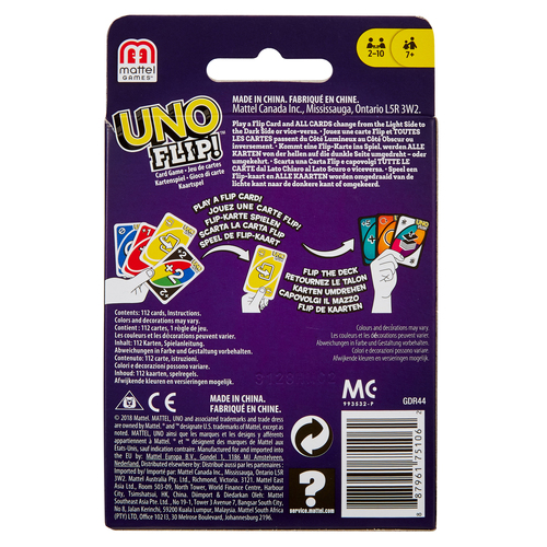 | | Beschreibung: | Die neueste Version des klassischen UNO: UNO FLIP! verleiht dem bekannten Kartenspiel einen neuen Twist ? mit beidseitig bedruckten Karten und einer speziellen FLIP-Karte. So kommt frischer Wind in das traditionelle Spiel. Die Spieler legen der Reihe nach eine ihrer Handkarten auf den Ablegestapel, sodass sie der dort oben liegenden Karte in Zahl oder Farbe entspricht. Ziel ist es, die Karten auf der Hand so schnell wie möglich abzulegen. Dabei kommen spezielle Karten wie Aussetzen, Retour und Farbenwahl zum Einsatz. UNO FLIP! umfasst auch neue Aktionskarten, die Bewegung ins Spiel bringen, zum Beispiel ''Zieh 5 oder ''Alle aussetzen. Wird die spezielle FLIP-Karte gespielt, dürfen alle Karten auf der Hand des Spielers, dem Ablegestapel und Kartenstapel umgedreht werden. So zeigen sie völlig neue Zahlen und Farben! Der Spieler mit der FLIP-Karte entscheidet, ob die helle oder die dunkle Seite des Decks gespielt wird ? und wann dies wieder geändert werden muss. Wer die richtige Strategie hat und seine Karten als Erster ablegt, gewinnt. Hat ein Spieler nur noch eine Karte übrig, muss er ''UNO rufen. Abweichungen in Farbe und Gestaltung vorbehalten.15 Minutenab 7 JahrenUNO2 - 10 SpielerHauptmerkmale Merkmale Produkttyp Kartenspiel Genre Ablösung Minimale Anzahl an Spielern 2 Maximale Anzahl an Spielern 10 Empfohlene Altersgruppe Erwachsener & Kind Vorgeschlagenes Geschlecht Beide Geschlechter Empfohlenes Alter in Jahren (mind.) 7 Jahr(e) Anzahl der Karten 112 Stück(e) Ursprungsland China Leistung Batterien erforderlich Nein Verpackungsdaten Verpackungsbreite 92,3 mm Verpackungstiefe 19 mm Verpackungshöhe 144,4 mm Paketgewicht 160 g Verpackungsvolumen 253,2343 cmü Verpackungsart Box Lieferumfang Spielregeln Ja Akkus/Batterien enthalten Nein Sicherheitswarnung EU TSD Warnung Nicht für Kinder unter 36 Monaten geeignet Lieferanteneigenschaften Jahr 2022 Logistische Daten Menge pro ISO Container (20 Fuß) 69918 Stück(e) Menge pro ISO Container (40 Fuß) 150475 Stück(e) Anzahl Kartons pro Palette 344 Stück(e) Kartonanzahl pro Palettenschicht 344 Stück(e) Menge pro Palettenlage 4128 Stück(e) Produkte pro Palette 4128 Stück(e) Breite des Versandkartons 139,8 mm Länge des VersandkartonsUno Flip! von Mattel ist eine spannende Weiterentwicklung des klassischen UNO-Kartenspiels und eignet sich für 2 bis 10 Spieler ab sieben Jahren. Das Besondere an dieser Version ist das doppelseitige Kartendeck mit einer 'hellen' und einer besonders herausfordernden 'dunklen Seite'. Neue Aktionskarten wie 'Zieh fünf' oder 'Alle aussetzen' sorgen für überraschende Wendungen und strategische Tiefe bei jedem Spielzug. Dank der kompakten Verpackung ist Uno Flip! ideal für unterwegs, Familienabende oder Partys geeignet. Das Set besteht aus insgesamt 112 hochwertigen Spielkarten aus langlebigen Materialien ' so bleibt der Spielspaß lange erhalten. Als weltweit führender Hersteller setzt sich Mattel aktiv für Nachhaltigkeit ein: Bis zum Jahr 2030 sollen alle Produkte und Verpackungen auf recycelte oder biobasierte Kunststoffe umgestellt werden. Mit dem Kauf von Uno Flip! leisten Kunden einen Beitrag zu verantwortungsvollem Konsumverhalten und fördern nachhaltiges Spielen mit Spaßgarantie. |  | | Mindestalter: |