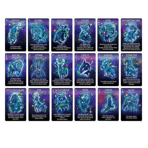 VerpackungsinhaltEnthält 1 Schale, 1 Kojotenfigur, 30 doppelseitige Tierbretter (Englisch und Deutsch), 56 Spielsteine, 1 Stoffbeutel, 12 Aktionssteine und 36 magische Aktionskarten (18 in Englisch, 18 in Deutsch).