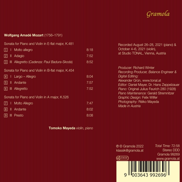 Sonate für Violine und Klavier Es-Dur KV 481 01. "1. Molto allegro" 02. "2. Adagio" 03. "3. Allegretto (Kadenz: Paul Badura-Skoda)" Sonate für Violine und Klavier B-Dur KV 454 "Strinasacchi" 04. "1. Largo - Allegro" 05. "2. Andante" 06. "3. Allegretto" Sonate für Klavier und Violine A-Dur KV 526 07. "1. Molto allegro" 08. "2. Andante" 09. "3. Presto"
