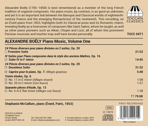 Beschreibung:Although Alexandre Boely (1785-1858) is best remembered as an important Parisian organist-composer, his piano music is as good as unknown. Yet it is an important link between the Baroque and Classical worlds of eighteenth-century France and the emerging Romanticism of the nineteenth. This recording, on an Erard piano from 1853, highlights both it's Classical poise and it's Romantic charm. It reveals Boely as a forerunner of composers like Saint-Saens, whom he taught, as well as other piano pioneers such as Alkan, Chopin and Liszt, all of whom this prominent Parisian musician and teacher may well have known personally. Stephanie McCallum is Associate Professor in piano at the Sydney Conservatorium of Music of the University of Sydney, where she herself studied with Alexander Sverjensky and with the noted Liszt player, Gordon Watson. After advanced studies in England with the Alkan authority Ronald Smith, she made her Wigmore Hall debut in 1982. She has appeared extensively as a soloist in Australia, France and the United Kingdom. Her recording of the complete Alkan 'Recueils de chants' for Toccata Classics was received with universal praise. She followed them up with a Toccata Classics album of piano music by Guy Ropartz., Runningtime: 00:00:00, Labelcode TCCT471.2