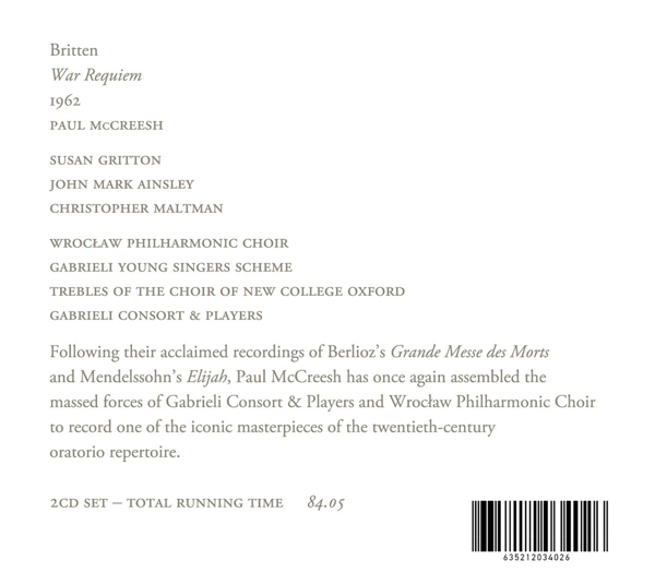 Following their acclaimed recordings of Berlioz's Grande Messe des Morts and Mendelssohn's Elijah, Paul McCreesh has once again assembled the mass forces of Gabrieli Consort & Players and Wroclaw Phiharmonic Choir to record one of the iconic masterpieces of the 20th century oratorio repertoire. The work reflects Britten's long-held and committed pacifist beliefs. Composed to mark the consecration of a new Cathedral in Coventry, Britten combines the Latin text of the Missa pro Defunctiswith nine poems by the First World War poet Wilfred Owen, which provide a moving (and frequently uncomfortable) commentary on the liturgical text., Runningtime: 00:00:00, Labelcode SGUK340.2