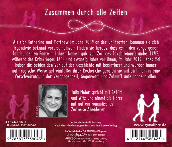 Disc 01 01. WEIGERT,JACOB "ANSAGE" 02. MEIER,JULIA "PROLOG BEI IHRER LETZTEN BEGEGNUNG" 03. MEIER,JULIA "K, ICH GEHE NUR KURZ I" 04. MEIER,JULIA "CAMPUS DER UNIVERSITAET NOTTINGHAM, ENGLAND, 2039" 05. MEIER,JULIA "CARLISLE, ENGLAND, 1745" 06. MEIER,JULIA "BERICHTERSTATTER DER TIMES SUCHT ..." 07. MEIER,JULIA "M, ICH BIN SCHOCKIERT" 08. MEIER,JULIA "CARLISLE, ENGLAND, 1745. TANTE ELIZABETH" 09. MEIER,JULIA "VOR DER FRANZOESISCHEN ATLANTIKKUESTE I" 10. MEIER,JULIA "VOR DER FRANZOESISCHEN ATLANTIKKUESTE II" 11. MEIER,JULIA "KATHERINE, LIEBES, ICH FUEHLE MICH" 12. MEIER,JULIA "CARLISLE, ENGLAND, 1745. KATHERINE WAR" 13. MEIER,JULIA "NEWSBREAKING.COM: TERRORANSCHLAG IN LABOR" 14. MEIER,JULIA "UNI NOTTINGHAM, ENGLAND, 2039. KATE STARRTE" 15. MEIER,JULIA "CARLISLE, ENGLAND, 1745. KATHERINE ERWACHTE" 16. MEIER,JULIA "VOR DER PORTUGIESISCHEN ATLANTIKKUESTE, 1854" 17. MEIER,JULIA "NOTTINGHAM, ENGLAND, 2039 I" 18. MEIER,JULIA "NOTTINGHAM, ENGLAND, 2039 II" 19. MEIER,JULIA "CARLISLE, ENGLAND, 1745. KATHERINE HATTE I" 20. MEIER,JULIA "CARLISLE, ENGLAND, 1745. KATHERINE HATTE II" 21. MEIER,JULIA "CAMPUS DER UNI NOTTINGHAM, ENGLAND, 2039. KATE WAR" 22. MEIER,JULIA "STRASSE VON GIBRALTAR, 1854"