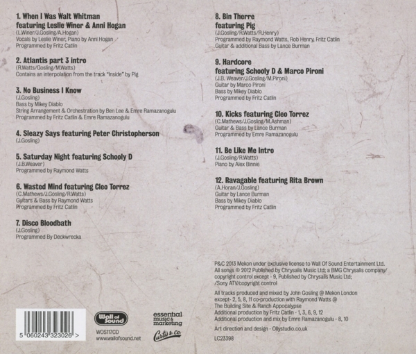 01. Mekon / Winer, Leslie / Hogan, Anni "When I was Walt Whitman" 02. Mekon "Atlantis [Part 3] (Intro)" 03. Mekon "No business I know" 04. Mekon / Christopherson, Peter "Sleazy says" 05. Mekon / Schooly D "Saturday night" 06. Mekon / Torrez, Cleo "Wasted mind" 07. Mekon "Disco bloodbath" 08. Mekon / Pig "Bin Therre" 09. Mekon / Schooly D / Pironi, Marco "Hardcore" 10. Mekon / Torrez, Cleo "Kicks" 11. Mekon "Be like me (Intro)" 12. Mekon / Brown, Rita "Ravagable"