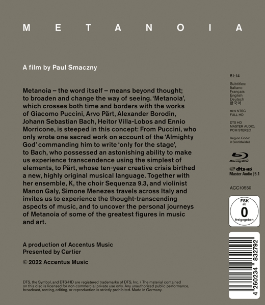 | | Beschreibung: | Metanoia - the word itself - means beyond thought; to broaden and change the way of seeing. 'Metanoia', which crosses both time and borders with the works of Giacomo Puccini, Arvo Pärt, Alexander Borodin, Johann Sebastian Bach, Heitor Villa-Lobos and Ennio Morricone, is steeped in this concept: From Puccini, who only wrote one sacred work on account of the 'Almighty God' commanding him to write 'only for the stage', to Bach, who possessed an astonishing ability to make us experience transcendence using the simplest of elements, to Pärt, whose ten-year creative crisis birthed a new, highly original musical language. Together with her ensemble, K, the choir Sequenza 9.3, and violinist Manon Galy, Simone Menezes travels across Italy and invites us to experience the thought-transcending aspects of music, and to uncover the personal journeys of Metanoia of some of the greatest figures in music and art., Runningtime: 00:00:00, Labelcode ACCT10550BR |  | | Spielzeit: |
