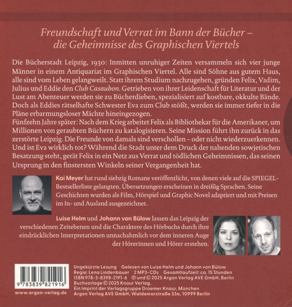 "Das Antiquariat am alten Friedhof" ist ein atmosphärisches Hörspiel nach dem Roman des bekannten deutschen Autors Kai Meyer. Die Produktion auf CD entführt die Hörer in eine geheimnisvolle Welt voller alter Bücher und vergessener Geheimnisse rund um einen historischen Friedhof. Mit einer fesselnden Handlung, eindrucksvollem Sounddesign und hervorragenden Sprechern bietet dieses Hörspiel ein besonderes Erlebnis für Liebhaber spannender Geschichten. Der Hersteller Argon zählt zu den führenden deutschen Hörbuchverlagen und ist bekannt für hochwertige Produktionen sowie Kooperationen mit namhaften Autoren ? auch diese Veröffentlichung setzt ihre Tradition fort, Literatur durch Audio lebendig werden zu lassen.
