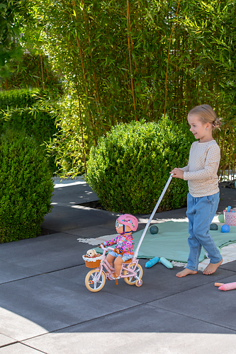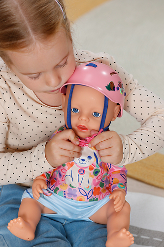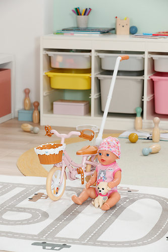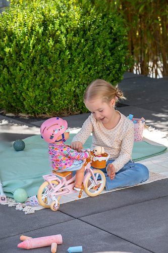Aufsteigen, losradeln und Spaß haben ? mit dem BABY born Fahrrad mit Lucky geht?s auf große Tour! Das liebevoll gestaltete Holland-Rad ist perfekt für spannende Ausflüge mit BABY born und ihren Freunden. Ob Emma, Annabell, Carla oder Lena ? dank höhenverstellbarer Schiebestange, stabiler Sitzhalterung und praktischen Schlaufen an Pedalen und Lenker sitzen alle Puppen sicher im Sattel. Im Fahrradkörbchen hat der süße Hundewelpe Lucky seinen Platz. Mit seinem Wackelkopf und den beweglichen Ohren sorgt er unterwegs für gute Laune und begleitet BABY born treu auf jedem Abenteuer. Die detailreiche Ausstattung begeistert kleine Puppenfans: Blumen schmücken den Korb, Donut-Stützräder sorgen für einen sicheren Start und im Vorderrad ist Berta zu sehen. Der Korb lässt sich abnehmen, und mit den beiliegenden Stickern kann das Rad individuell dekoriert werden. So wird jede Radtour zum fantasievollen Spielspaß ? egal ob reale Abenteuer drinnen nachgespielt werden oder es mal einen kurzen Ausflug auf die Terrasse gibt.
