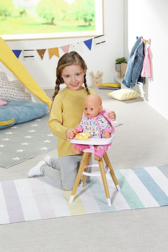 Beschreibung:'Im praktische Hochstuhl kannst du BABY born ganz einfach füttern. Der Stuhl im skandinavischen Design hat Beine in Holz-Optik und einen bequemen pinken Sitz. Bär Bruno und Ente Berta warten auf der Rückenlehne auch schon gespannt aufs Essen. Auf dem hellrosa Tischchen haben BABY borns Breiteller und ihre Flasche Platz. Und natürlich ist das Tischchen nicht nur zum Essen da. Hier darf auch gemalt, gebastelt und mit Bauklötzen gespielt werden. Hochwertiges Zubehör für die BABY born Markenspielpuppe. Für erweitertes, abwechslungsreiches und langanhaltendes Spielvergnügen. Auch für kleinere Puppen geeignet. BABY born Hochstuhl''