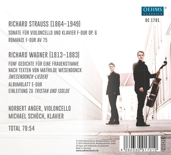 | Beschreibung: | Cello: Norbert Anger, Piano: Michael Schöch, Composed By: Richard Strauss, Composed By: Richard Strauss, Composed By: Richard Wagner, Composed By: Richard Wagner, Composed By: Richard Wagner, Labelcode OEHM1701.2 (OC 1701), Phonographic Copyright (p) OehmsClassics Musikproduktion GmbH, Copyright (c) OehmsClassics Musikproduktion GmbH |