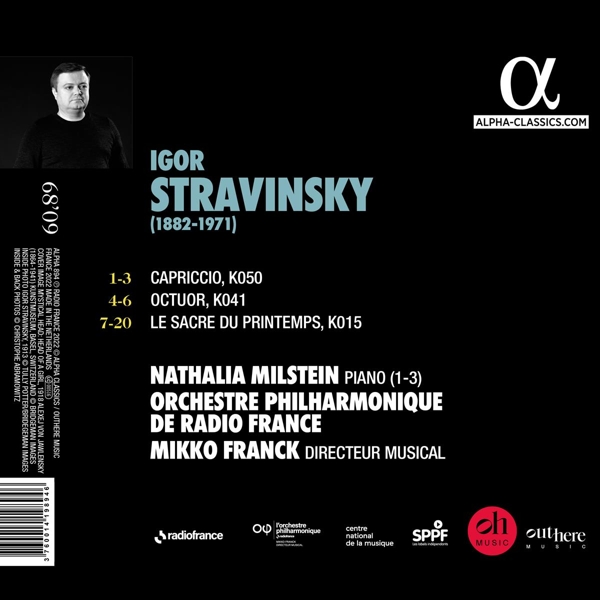 Capriccio, K050 01. Nathalia Milstein "I. Presto" 02. Nathalia Milstein "II. Andante rapsodico" 03. Nathalia Milstein "III. Allegro capriccioso ma tempo giusto" Octuor, K041 04. Orchestre Philharmonique de Radio France "I. Sinfonia" 05. Orchestre Philharmonique de Radio France "II. Tema con variazione" 06. Orchestre Philharmonique de Radio France "III. Finale" Le sacre du printemps, K015 07. Orchestre Philharmonique de Radio France "I. L'Adoration de la Terre. Introduction" 08. Orchestre Philharmonique de Radio France "II. L'Adoration de la Terre. Les Augures printaniers" 09. Orchestre Philharmonique de Radio France "III. L'Adoration de la Terre. Jeu du rapt" 10. Orchestre Philharmonique de Radio France "IV. L'Adoration de la Terre. Rondes printani?res" 11. Orchestre Philharmonique de Radio France "V. L'Adoration de la Terre. Jeux des cit?s rivales" 12. Orchestre Philharmonique de Radio France "VI. L'Adoration de la Terre. Cort?ge du sage (Le Sage)" 13. Orchestre Philharmonique de Radio France "VII. L'Adoration de la Terre. Embrasse de la terre" 14. Orchestre Philharmonique de Radio France "VIII. L'Adoration de la Terre. Danse de la terre" 15. Orchestre Philharmonique de Radio France "IX. Le Sacrifice. Introduction" 16. Orchestre Philharmonique de Radio France "X. Le Sacrifice. Cercles myst?rieux des adolescentes" 17. Orchestre Philharmonique de Radio France "XI. Le Sacrifice. Glorification de l'?lue" 18. Orchestre Philharmonique de Radio France "XII. Le Sacrifice. Evocation des anc?tres" 19. Orchestre Philharmonique de Radio France "XIII. Le Sacrifice. Action rituelle des anc?tres" 20. Orchestre Philharmonique de Radio France "XIV. Le Sacrifice. Danse sacrale (L'lue)"