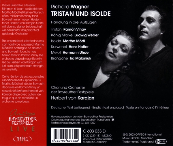 Beschreibung:Baritone Vocals: Hermann Uhde, Baritone Vocals: Werner Faulhaber, Bass Vocals: Hans Hotter, Bass Vocals: Ludwig Weber, Choir: Chor Der Bayreuther Festspiele, Contralto Vocals: Ira Malaniuk, Directed By: Wieland Wagner, Liner Notes: Wolfgang Wagner (6), Mezzo-soprano Vocals: Martha Mödl, Orchestra: Orchester Der Bayreuther Festspiele, Tenor Vocals: Gerhard Stolze, Tenor Vocals: Gerhard Unger, Tenor Vocals: Ramón Vinay, Labelcode NXS603033.2 (C 603 033 D), Recorded At Festspielhaus, Bayreuth, Phonographic Copyright (p) ORFEO International Music GmbH
