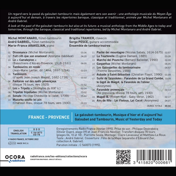 01. Michel Montanaro "Dissonance" 02. Michel Montanaro "Tuit cilh que son enamorat" 03. Michel Montanaro "Le ® Carrateyron ¯" 04. Andr? Gabriel "Tambourins en rondo" 05. Michel Montanaro "Tambourin" 06. Lei tambourinaire de Santo Estello "Fantaisie sur des noels provencaux" 07. Ensemble de fl?tets-tambourins "Les ® Tripeto ¯" 08. Michel Montanaro "Tripetas tripotadas" 09. Andr? Gabriel "Sonate" 10. Ferdinand Bain "Mazurka soutto lei pin" 11. Serge Pesce "Pastre dei mountagno" 12. Andr? Gabriel "La Tourterelle" 13. Ensemble de fl?tets-tambourins "Marcho dei Pounchu" 14. Michel Montanaro "Gargantua" 15. Andr? Gabriel "Les Galoupettes du tambourinaire" 16. Ensemble de fl?tets-tambourins "Aubade ? Saint-S?bastien" 17. Michel Montanaro "Suite de farandoles : Farandole de La Grand Combe, le Gigot de Margot, la Farandole de l'olivier" 18. Choeur de la Couqueto "Farandole provencale" 19. Serge Pesce "Magali B." 20. Ensemble de fl?tets-tambourins "Airs de f?te : Lei Fielouo, Lei Cocot"