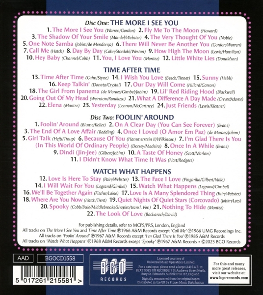 "The More I See You/Time After Time/Foolin' Around" ist eine CD-Veröffentlichung von Chris Montez beim Label Beat Goes On Records. Diese Sammlung vereint drei seiner klassischen Alben aus den 1960er Jahren und präsentiert seinen sanften Gesangsstil sowie die einzigartige Mischung aus Pop- und Latin-Einflüssen. Chris Montez wurde mit Hits wie "Let's Dance" und "Call Me" berühmt und etablierte sich als vielseitiger Künstler, der mühelos verschiedene Genres verbindet. Seine Musik begeistert seit Jahrzehnten Fans weltweit durch zeitlose Melodien und gefühlvolle Darbietungen. Das Label Beat Goes On Records ist bekannt für hochwertige Wiederveröffentlichungen klassischer Alben und sorgt dafür, dass legendäre Künstler wie Chris Montez auch heute noch neue Generationen begeistern.