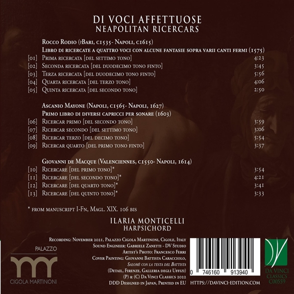 Libro di ricercate a quattro voci con alcune fantasie sopra varii canti fermi 01. "Prima ricercata (del settimo tono)" 02. "Seconda ricercata (del duodecimo tono finto)" 03. "Terza ricercata (del duodecimo tono finto)" 04. "Quarta ricercata (del terzo tono)" 05. "Quinta ricercata (del secondo tono)" Primo libro di diversi capricci per sonare 06. "Ricercar primo (del secondo tono)" 07. "Ricercar scondo (del settimo tono)" 08. "Ricercar terzo (del decimo tono)" 09. "Ricercar quarto (del primo tono finto)" 10. "Ricercare (del primo tono)" 11. "Ricercare (del secondo tono)" 12. "Ricercare (del quarto tono)" 13. "Ricercare (del quinto tono)"