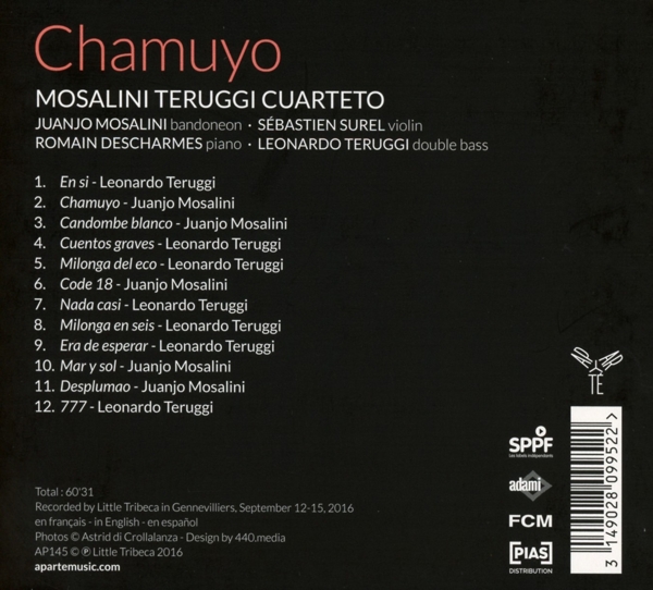| Beschreibung: | Bandoneon: Juan Jose Mosalini Jr., Contrabass: Leonardo Teruggi, Ensemble: Mosalini Teruggi Cuarteto, Photography By [Cover]: Astrid Di Crollalanza, Piano: Romain Descharmes, Violin: Sébastien Surel, Labelcode AP 145 (AP145), Record Company Little Tribeca, Distributed By [PIAS] Distribution, Phonographic Copyright (p) Little Tribeca, Copyright (c) Little Tribeca, Recorded At Auditorium Edgar Varèse, Genevilliers |