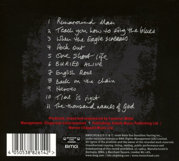| Beschreibung: | Digipak. Motörhead's 19th studio album, Motörizer was originally released on 26th August 2008 and was their third to be produced by Cameron Webb. Motörizer was the first album for the band to chart in the USA, debuting at number 82; it also reached number 5 in Germany. The album's lead single 'Rock Out' was featured as the official theme song to WWE Unforgiven, Runningtime: 00:00:00, Bass, Vocals: Ian Fraser Kilmister, Drums: Mikkey Dee, Engineer [Additional]: Sergio Chavez, Guitar: Phil Campbell, Management: Singerman Entertainment, Mastered By: Kevin Bartley, Producer [Produced by], Mixed By, Engineer [Engineered by]: Cameron Webb, Slide Guitar: Wesley Mischener, Labelcode BGRT826142.2 (BMGCAT783CD, BMGCAT783CD), Phonographic Copyright (p) Belle Vue Sunshine Touring Inc., Copyright (c) Belle Vue Sunshine Touring Inc., Licensed To BMG Rights Management (UK) Limited, Glass Mastered At Sonopress, Recorded At Studio 606, Recorded At Sage & Sound, Mixed At Maple Sound Studios, Mastered At Capitol Mastering, Published By Kobalt Music Publishing Ltd., Published By Warner Chappell Music Ltd. |  | Anzahl der Titel: |