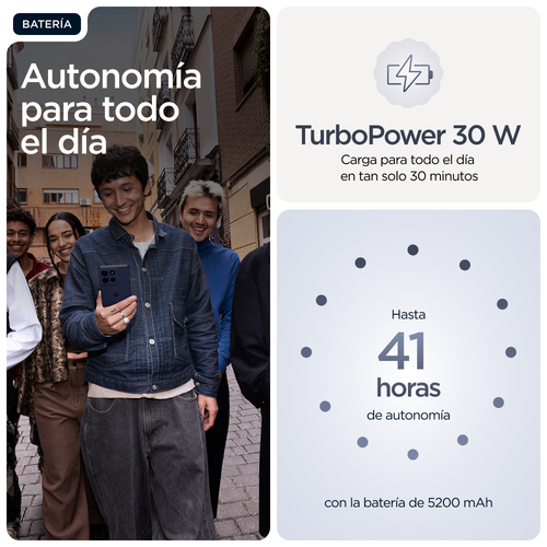 Motorola Moto G86 5G 256GB Spellbound 16,94cm (6,67") OLED Display, Android 15, 50MP Dual-Kamera (PB7L0086SE) Technische Daten Hersteller Motorola Betriebssystem Android 15.0 (ab Werk), 2 Betriebssystem-Updates, 4 Jahre Sicherheits-Updates Display 6.67", 2712x1220 Pixel, 1.07 Mrd. Farben, P-OLED, kapazitiver Touchscreen, Gorilla Glass 7i, flach, Kameraloch, HDR (HDR10+), 120Hz Aktualisierungsrate, 4500 Nits (maximal), 446ppi Kamera hinten 50.0MP, f/?1.88, Phasenvergleich-AF, OIS, LED-Blitz, Videos @2160p/?30fps (Kamera 1), 8.0MP, f/?2.2, Weitwinkelobjektiv, Makroobjektiv (Kamera 2) Kamera vorne 32.0MP, f/?2.2, Videos @2160p/?30fps Schnittstellen USB-C 2.0 (480Mb/?s), Wi-Fi 6 (WLAN 802.11a/?b/?g/?n/?ac/?ax), Bluetooth 5.4, NFC Sensoren Beschleunigungssensor, Gyroskop, Annäherungssensor, Lichtsensor, Kompass, Fingerabdrucksensor (Display) SoC MediaTek Dimensity 7300 CPU 4x 2.50GHz ARM Cortex-A78 + 4x 2.00GHz ARM Cortex-A55, 8 Kerne GPU ARM Mali-G615 MC2 RAM 8GB Speicher 256GB Navigation GPS,