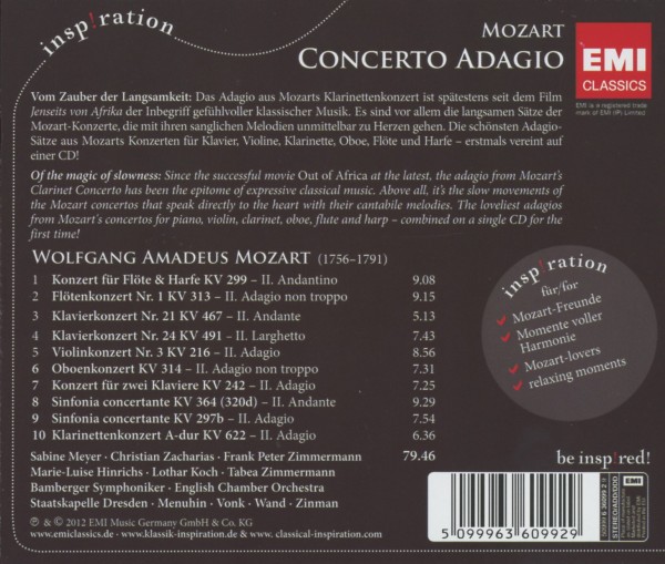 Concerto for Flute, Harp and Orchestra in C major K299/K297c (cadenzas: John Lenehan): II. Andantino 01. Samuel Coles/Naoko Yoshino/English Chamber Orchestra/Yehudi Menuhin "2. Andantino" Concerto for Flute and Orchestra No. 1 in G K313/K285c: II. Adagio ma non troppo 02. Samuel Coles/English Chamber Orchestra/Yehudi Menuhin "2. Adagio non troppo" Piano Concerto No.21 in C, K.467 (Cadenzas: Christian Zacharias) (Original 1989 ISRCs): II. Andante 03. Christian Zacharias/Symphonieorchester des Bayerischen Rundfunks/David Zinman "2. Andante" Piano Concerto No. 24 in C minor K491: II. Larghetto 04. Christian Zacharias/Sinfonieorchester des Norddeutschen Rundfunks/Günter Wand "2. Larghetto" Konzert für Violine und Orchester Nr.3 G-dur KV 216: II. Adagio (Kadenz: Franz Beyer: 1.04) 05. Frank Peter Zimmermann/Württembergisches Kammerorchester Heilbronn/J?rg Faerber "2. Adagio" Oboenkonzert KV 314 - II. Adagio non troppo 06. Lothar Koch/Philharmonische Solisten Berlin "2. Adagio non troppo" Konzerte für zwei Klaviere und Orchester KV 365 & KV 242, Sonate für zwei Klaviere KV 448, Konzert Für Zwei Klaviere Und 07. Marie-Luise Hinrichs/Bamberger Symphoniker/Christian Zacharias "2. Adagio" Sinfonia concertante für Violine, Viola und Orchester Es-dur KV 364 (320d): II. Andante 08. Frank Peter Zimmermann/Tabea Zimmermann/Gianluigi Gelmetti "2. Andante" Sinfonia concertante Es-dur KV 297b für Oboe, Klarinette, Horn, Fagott und Orchester: II. Adagio 09. Sabine Meyer/Diethelm Jonas/Bruno Schneider/Sergio Azzolini/Staatskapelle Dresden/Hans Vonk "2. Adagio" Clarinet Concerto in A Major, K. 622: II. Adagio 10. Sabine Meyer/Staatskapelle Dresden/Hans Vonk "2. Adagio"